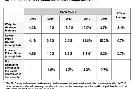 Covered California announced proposed health insurance rates for 2019 that will average single digits. The comparatively modest 8.7 percent average rate change, which some healthcare analysts expected to be in the high double-digits, is a testament to vigorous rate negotiations with insurance companies and a mix of healthy enrollees in the Covered California exchange, said ... -
